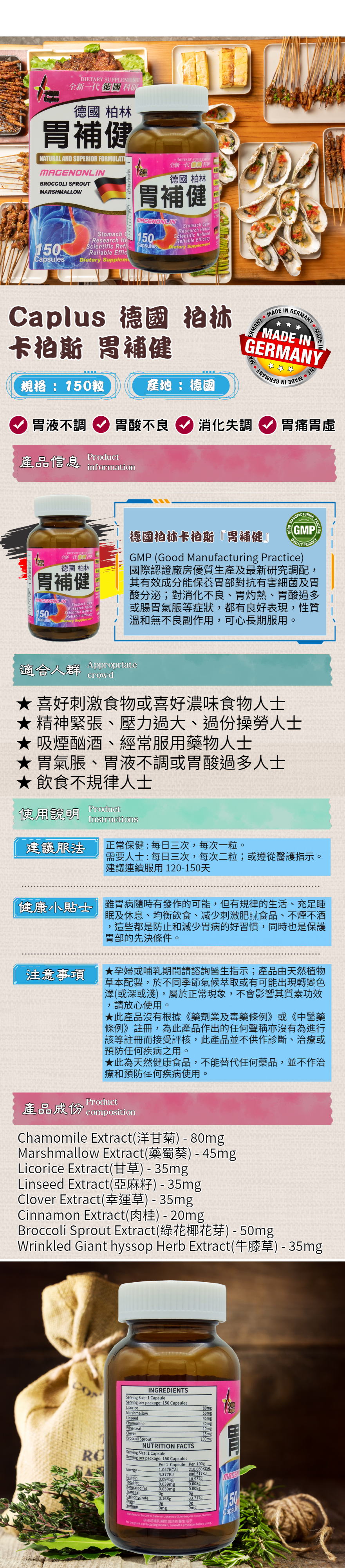 保養胃部對抗有害細菌及胃酸分泌,對消化不良、胃灼熱、胃酸過多或腸胃氣脹等有良好表現