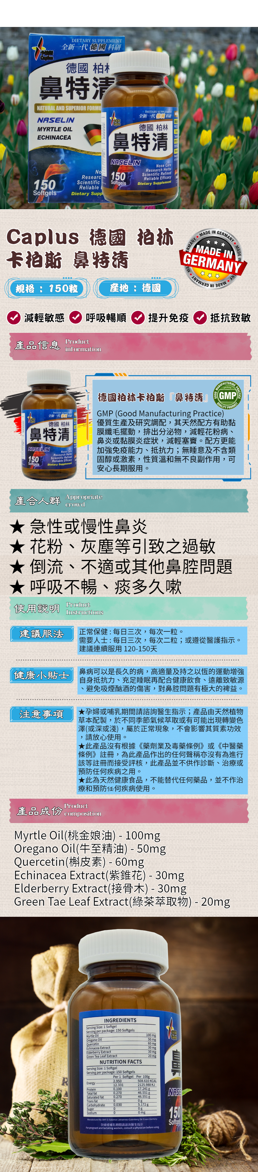 有助黏膜纖毛擺動,排出分泌物,減輕花粉病、鼻炎或黏膜炎症狀,減輕塞竇